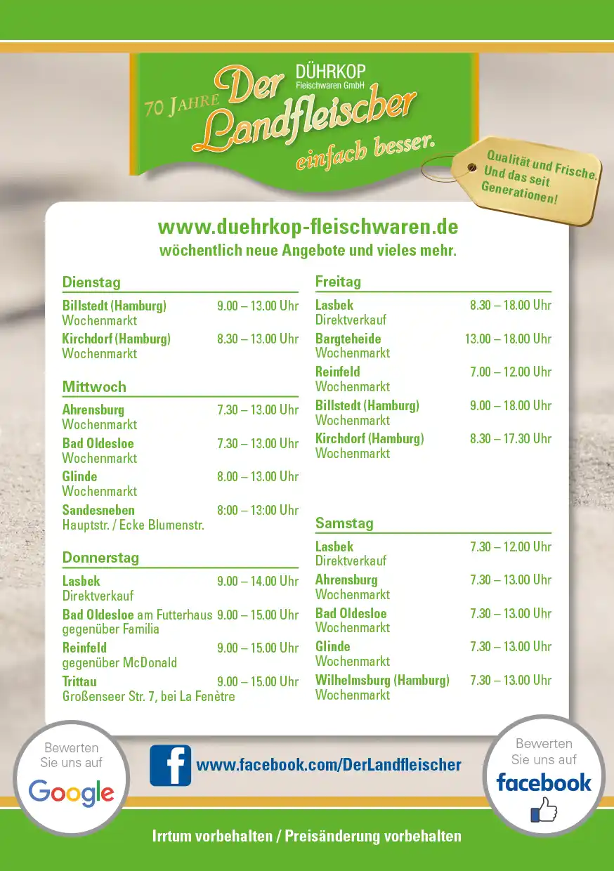 Das Team von Dührkop Fleischwaren ist zwar in Lasbek beheimatet, aber unser Herz schlägt auch auf den Wochenmärkten der Region. In Bad Oldesloe, Ahrensburg, Reinfeld, Billstedt, Glinde, Kirchdorf, Bargteheide, Trittau, Wilhelmsburg und Sandesneben bringen wir das Beste aus unserer Metzgerei direkt zu Ihnen: handwerklich hergestellte Wurst, zartes Fleisch aus kontrollierter Herkunft – und immer ein freundliches Wort über die Theke hinweg.